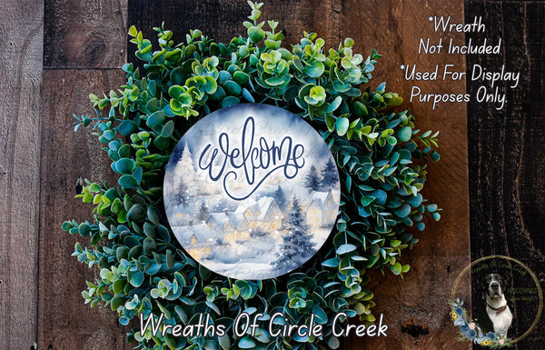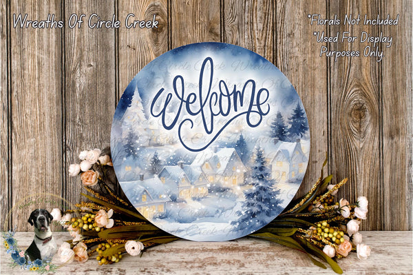Welcome Winter Village | Snowy Blue Christmas Scene | Lightweight Round Metal Wreath Sign | No Holes in Sign | Cozy Holiday Sign
