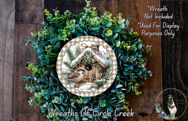 Winter Birdhouse Scene | Brown Gingham Christmas Decor | Lightweight Round Metal Wreath Sign | No Holes in Sign | Rustic Winter Sign
