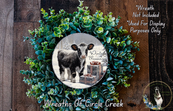 Winter Blessings Calf | Lightweight Round Metal Wreath Sign | No Holes in Sign | Farmhouse Christmas Decor
