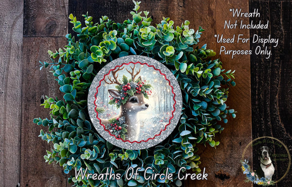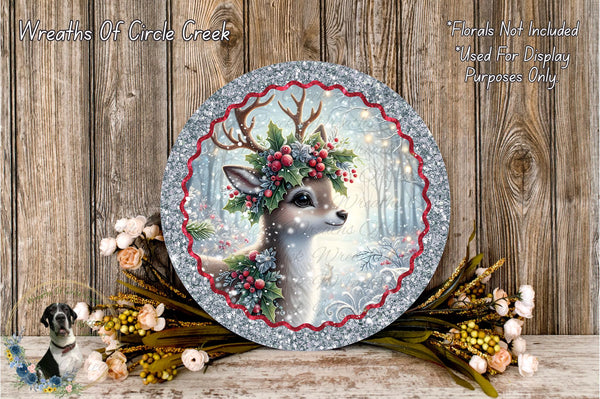 Winter Deer with Holly Crown | Silver Glitter Christmas Decor | Lightweight Round Metal Wreath Sign | No Holes in Sign | Elegant Woodland