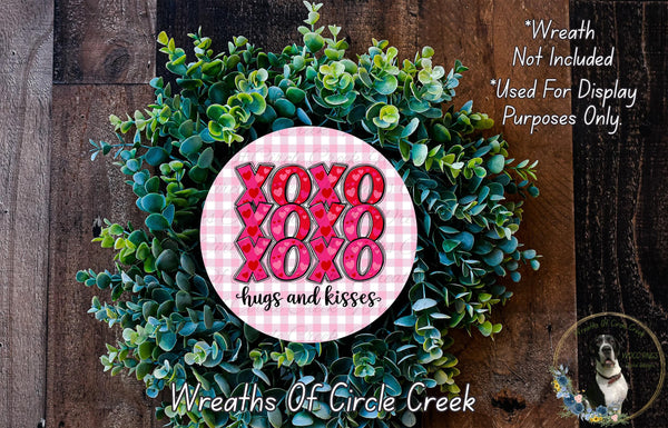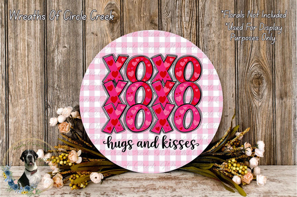 XOXO Hugs and Kisses Sign | Pink Plaid Valentine Decor | Lightweight Round Metal Wreath Sign | No Holes in Sign | Cute Heart Style