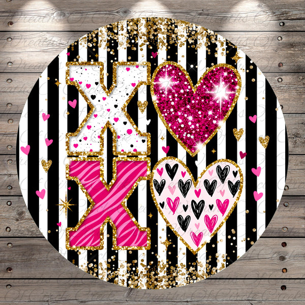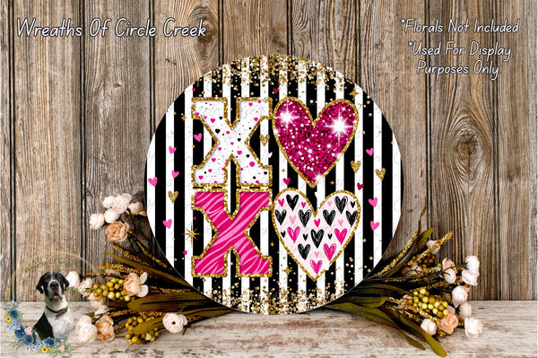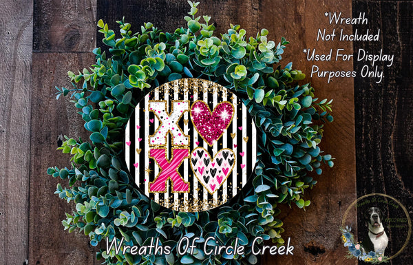 XOXO Valentine Hearts Decor | Pink Gold Glitter Love Sign | Lightweight Round Metal Wreath Sign | No Holes in Sign
